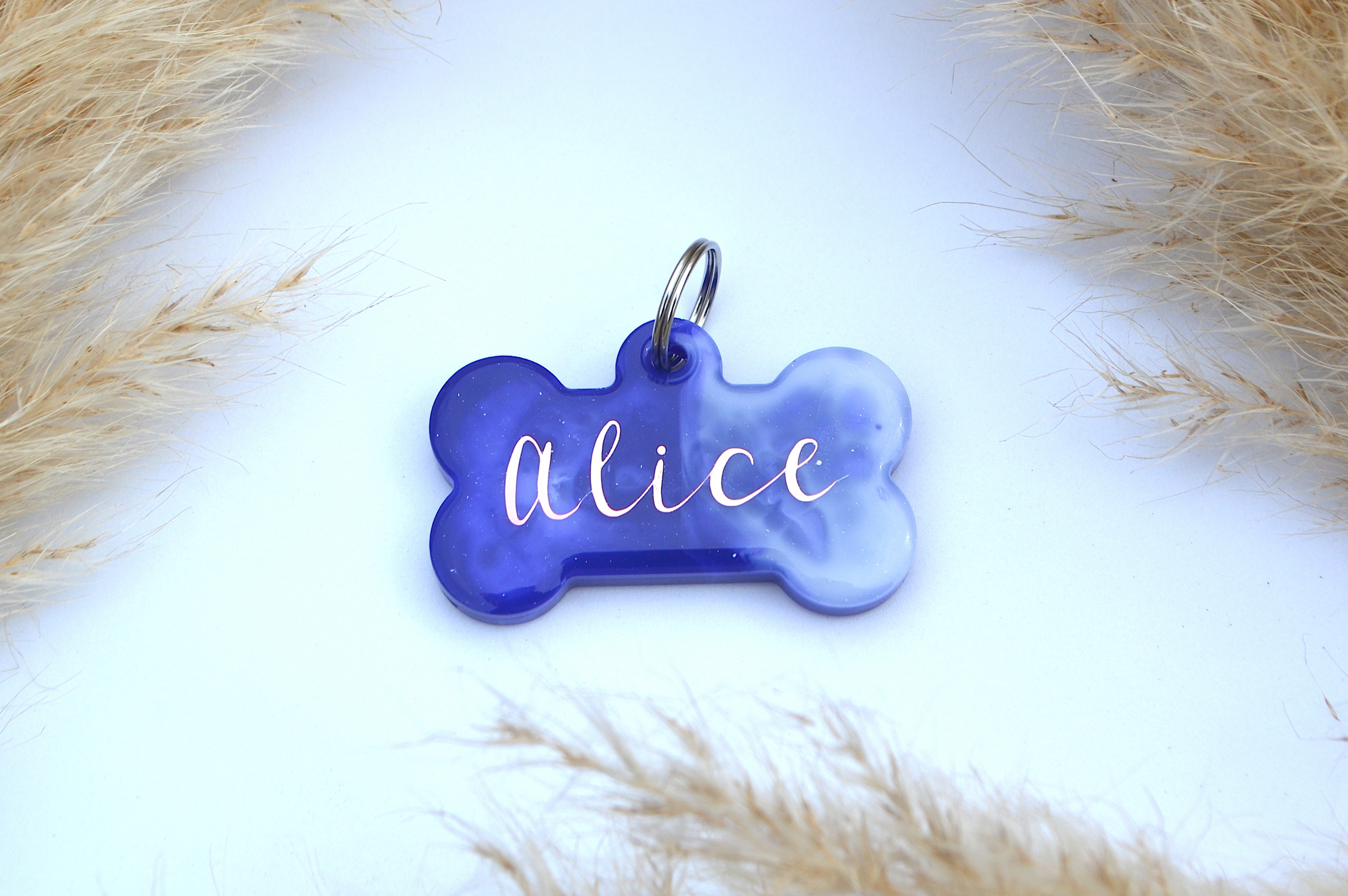 🔹 De fleste vælger at få hundens navn på forsiden – og ejers navn, adresse og telefonnummer på bagsiden.
