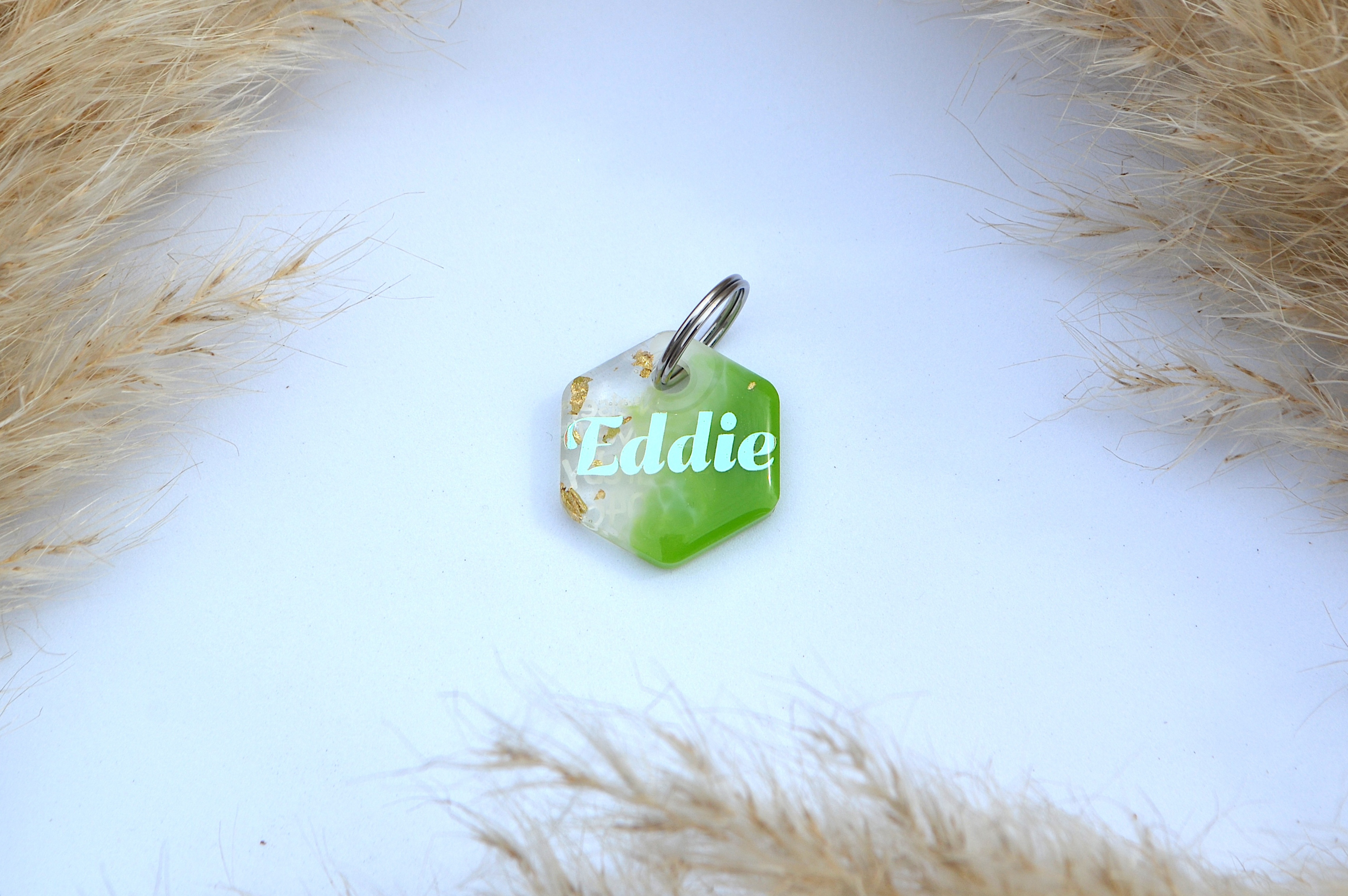 🔹 De fleste vælger at få hundens navn på forsiden – og ejers navn, adresse og telefonnummer på bagsiden.