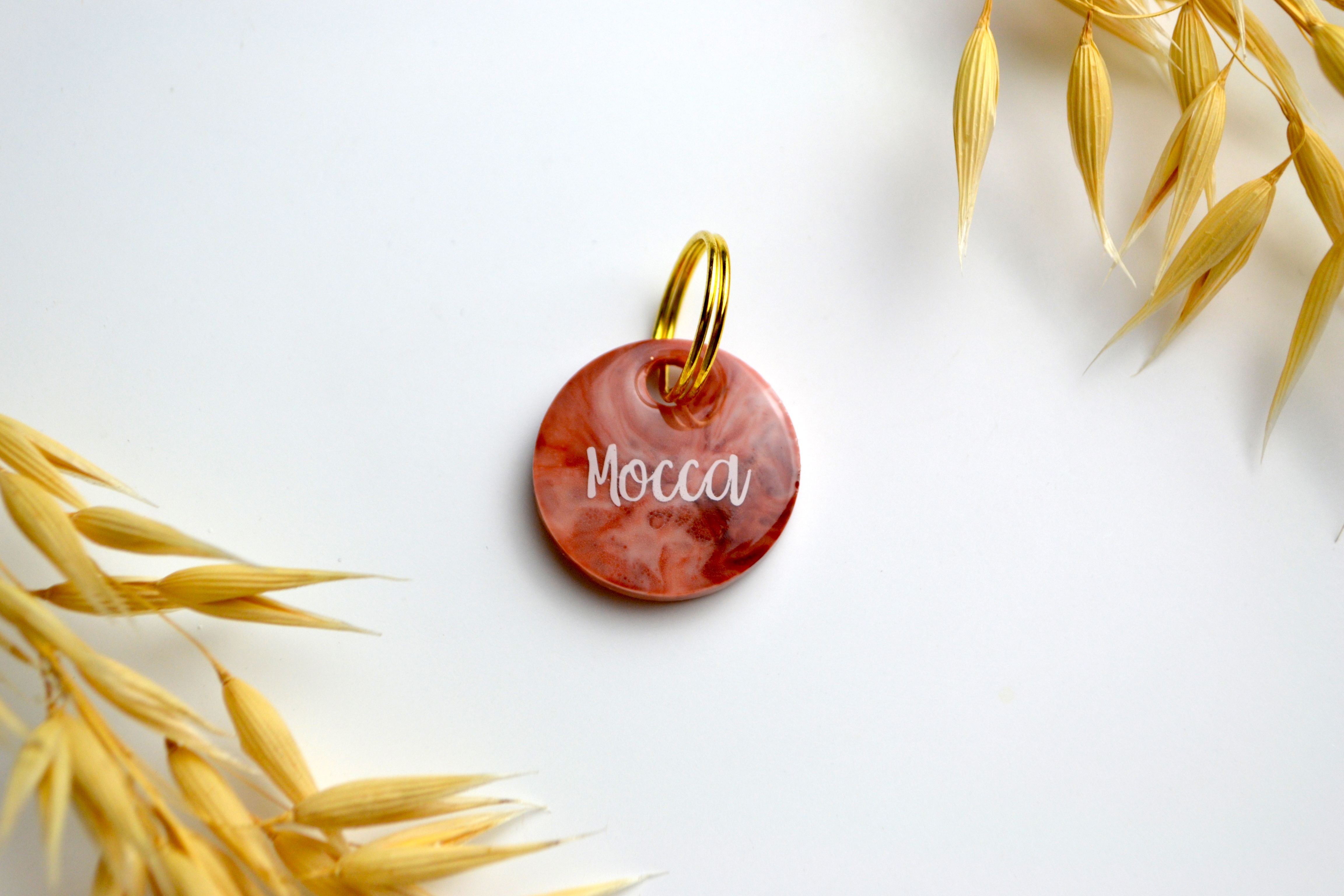🔹 De fleste vælger at få hundens navn på forsiden – og ejers navn, adresse og telefonnummer på bagsiden.