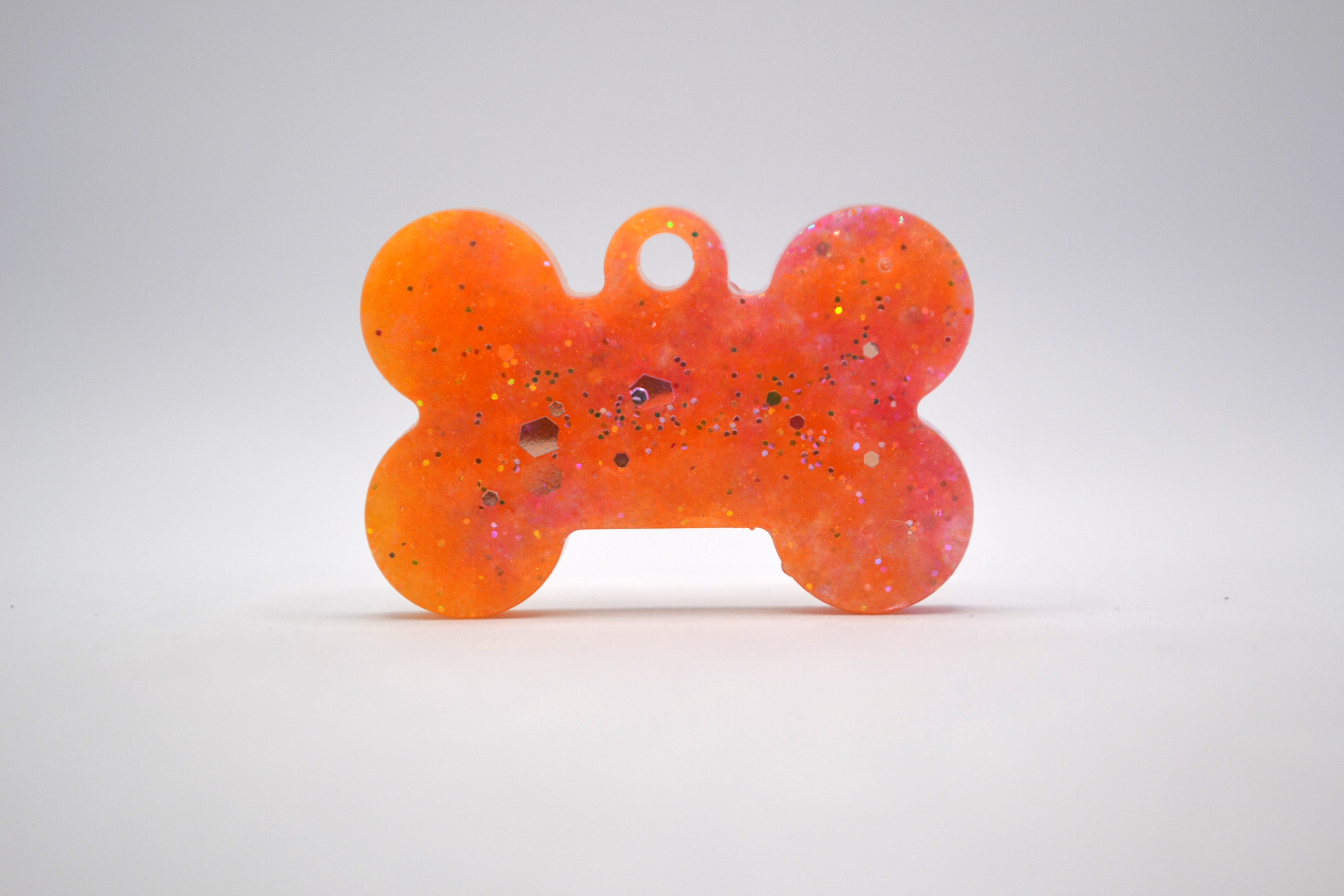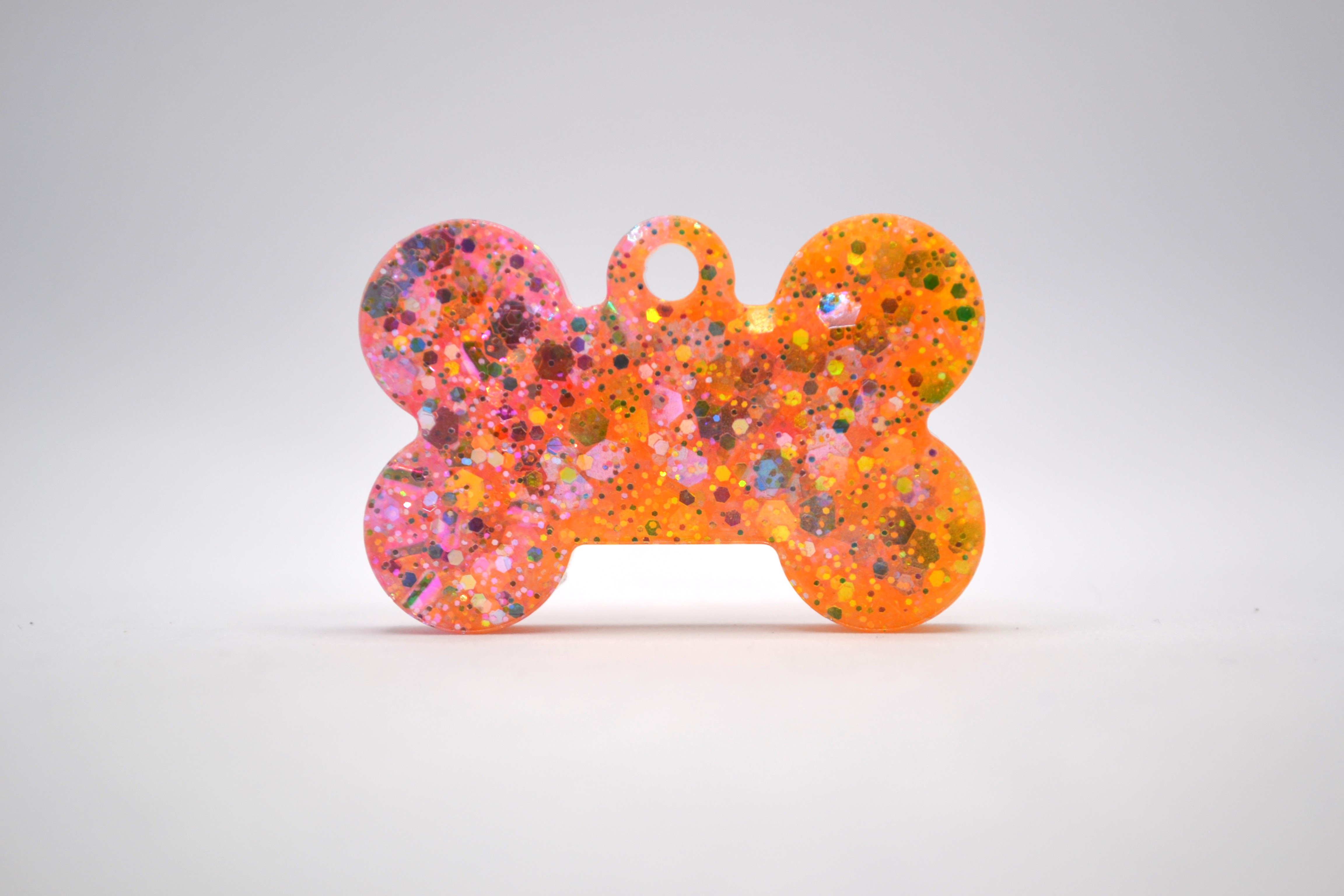 Hundetegn, lille kødben, orange og lyserød med glitter