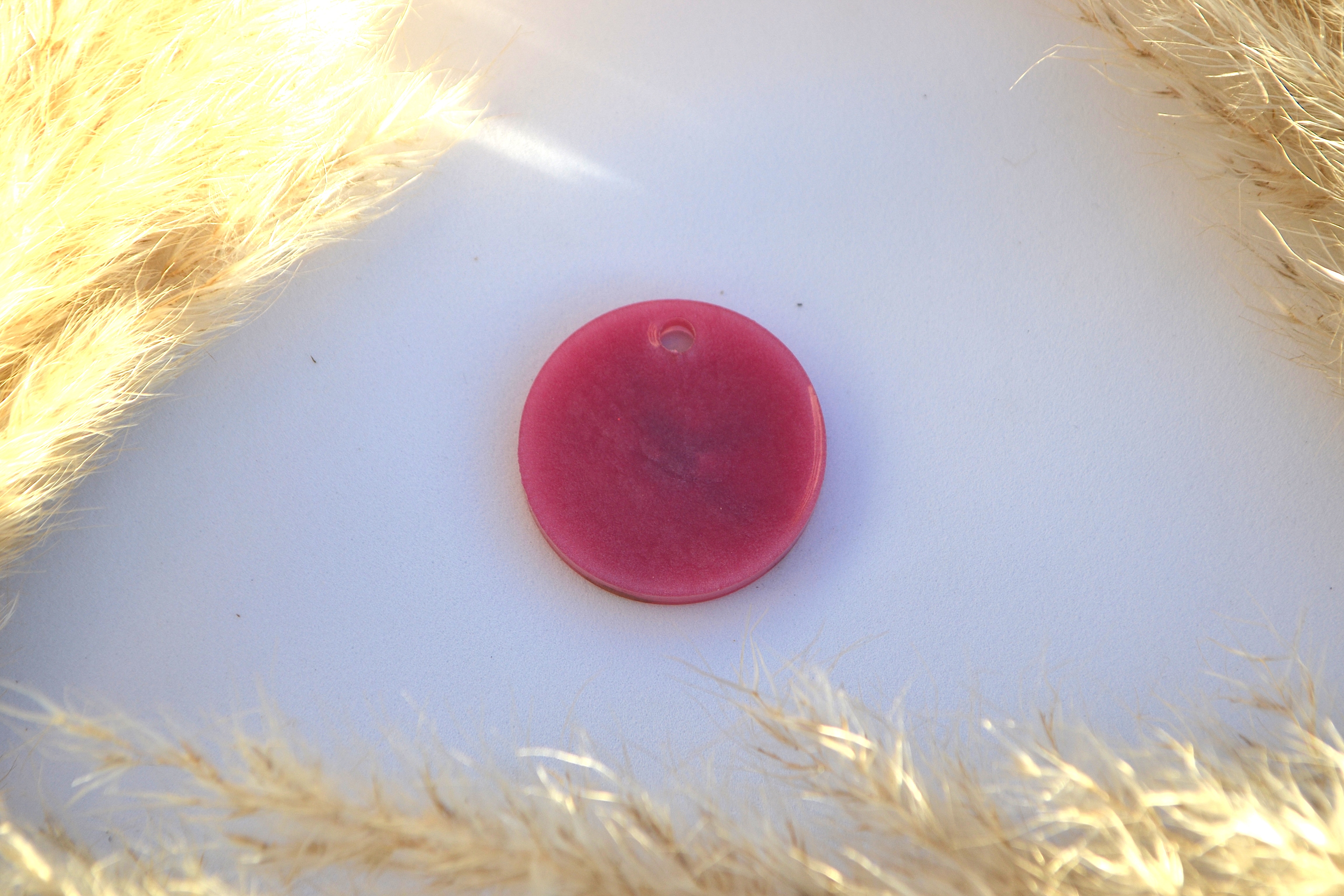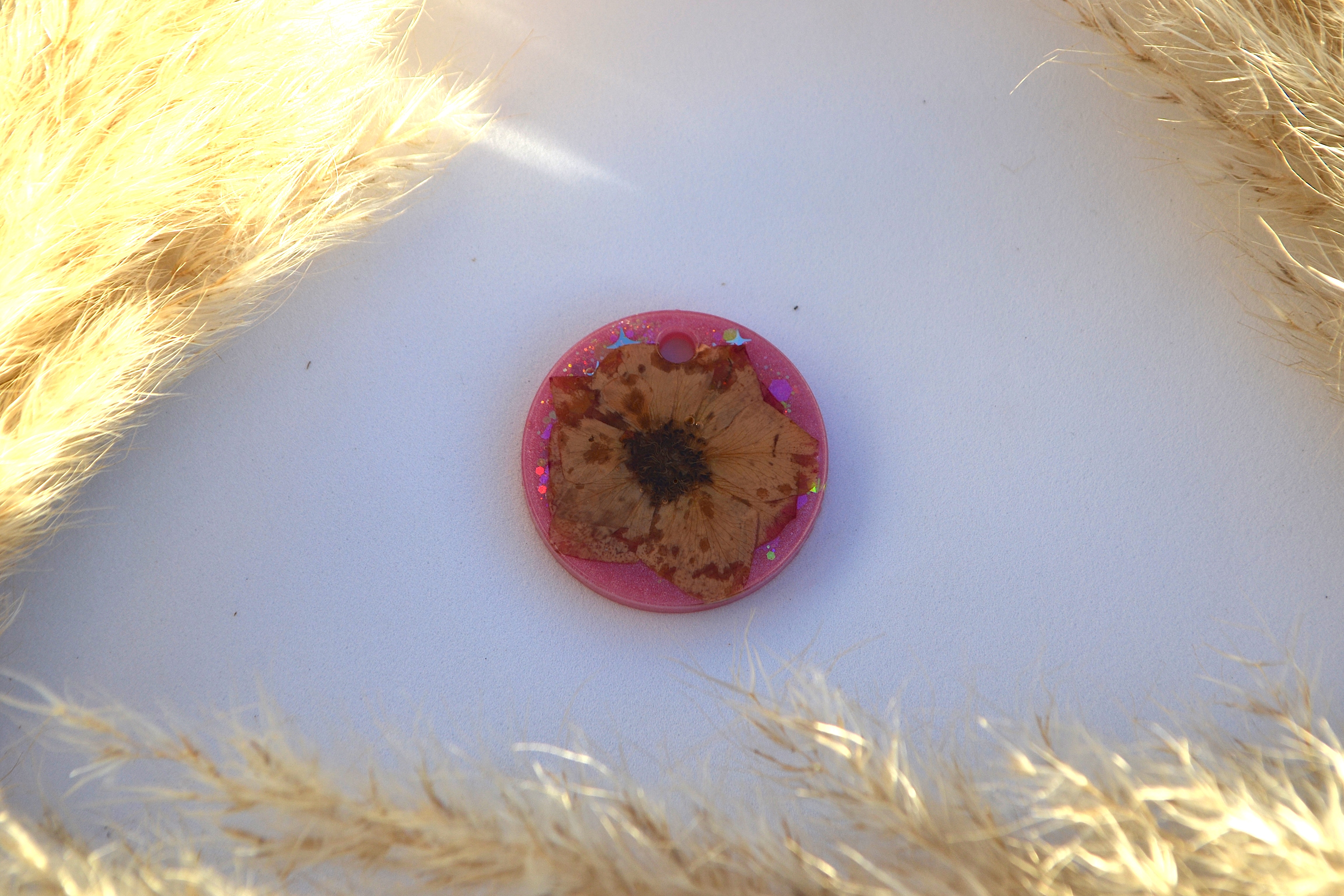 Hundetegn, stor rund, lyserød shimmer med glitter og blomst