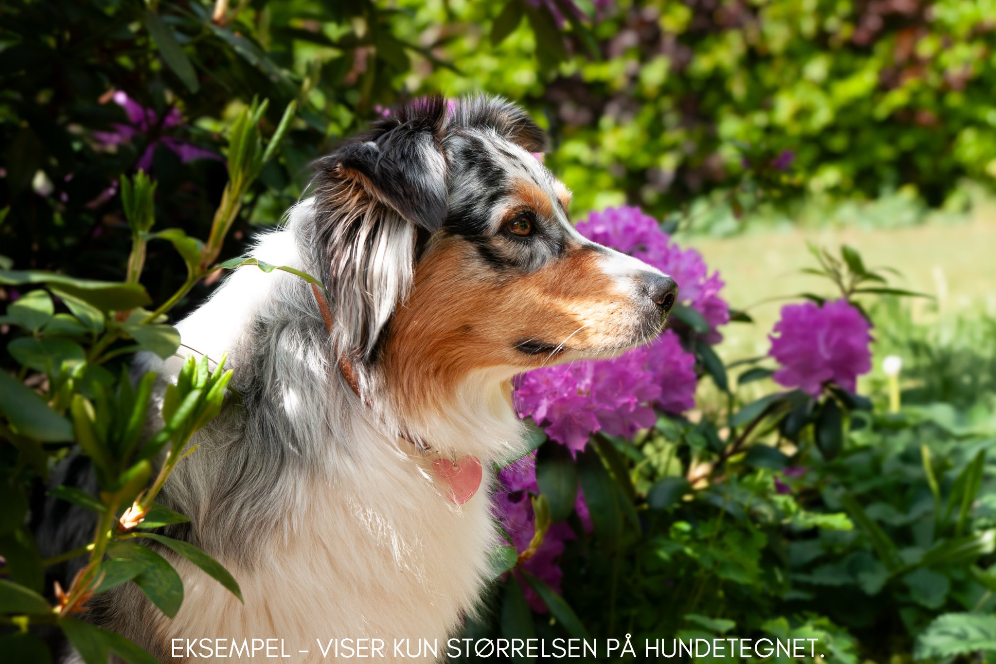 🔹 De fleste vælger at få hundens navn på forsiden – og ejers navn, adresse og telefonnummer på bagsiden.