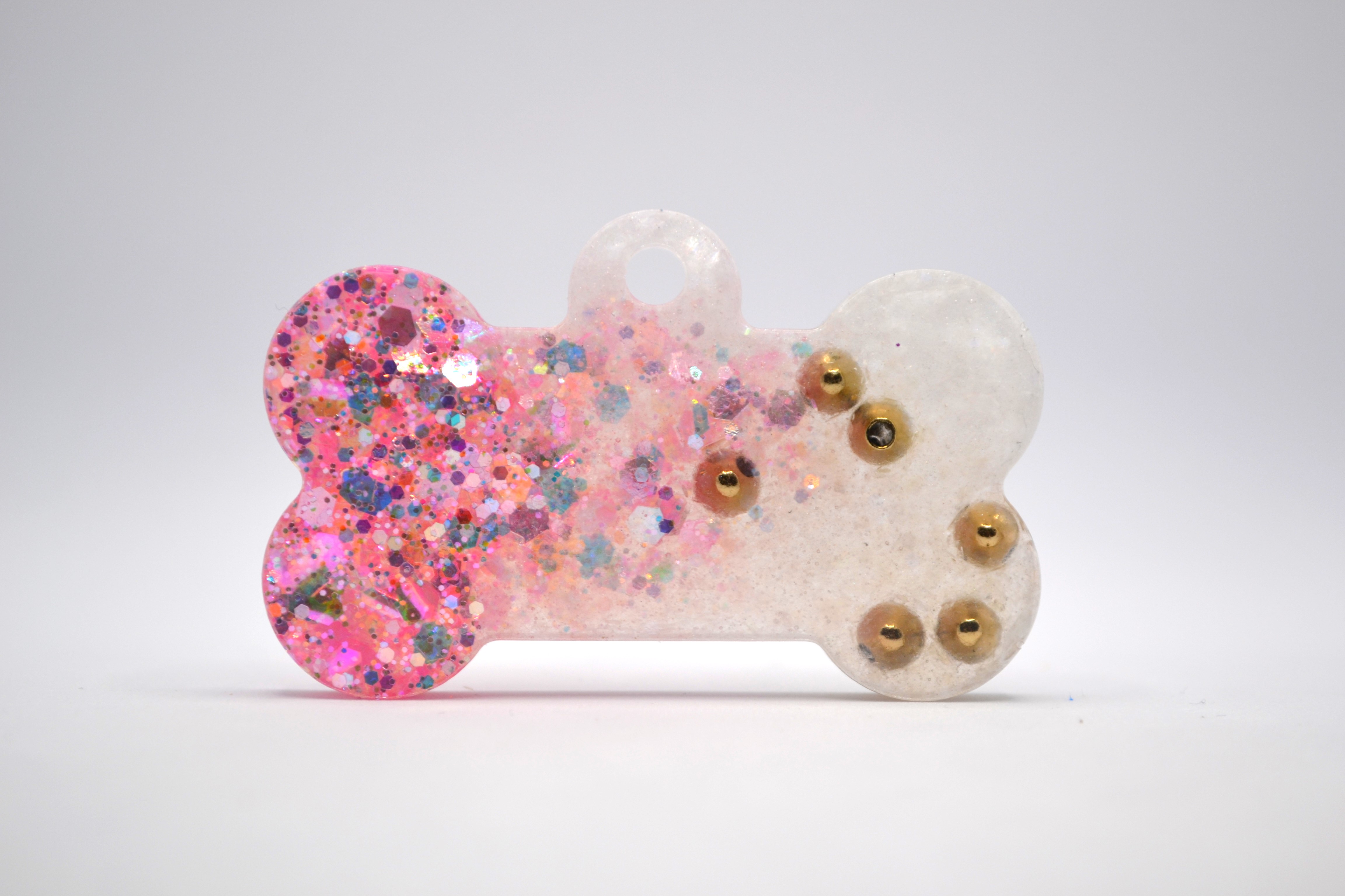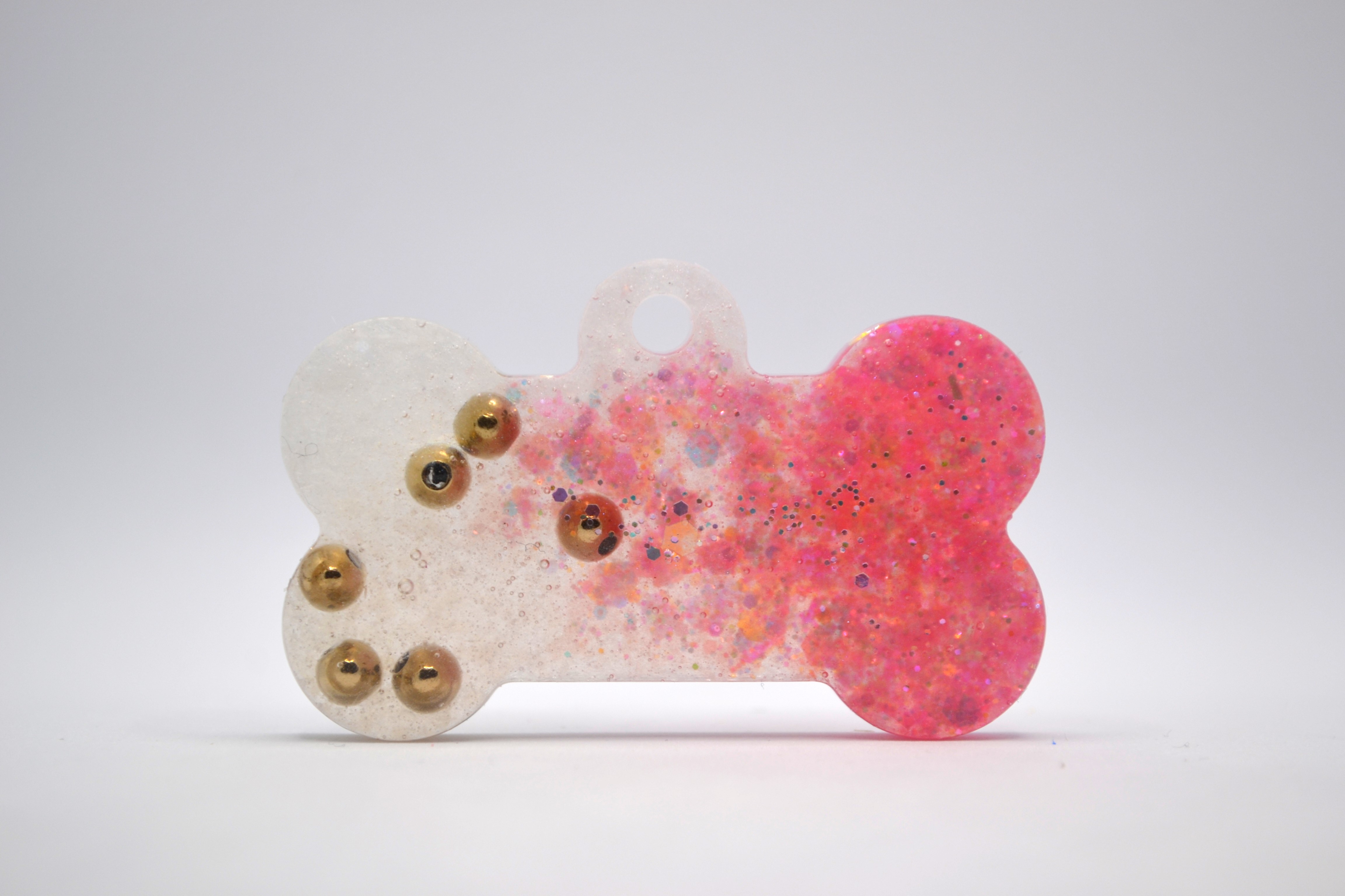 Hundetegn, stort kødben, pink og hvid glitter med perler