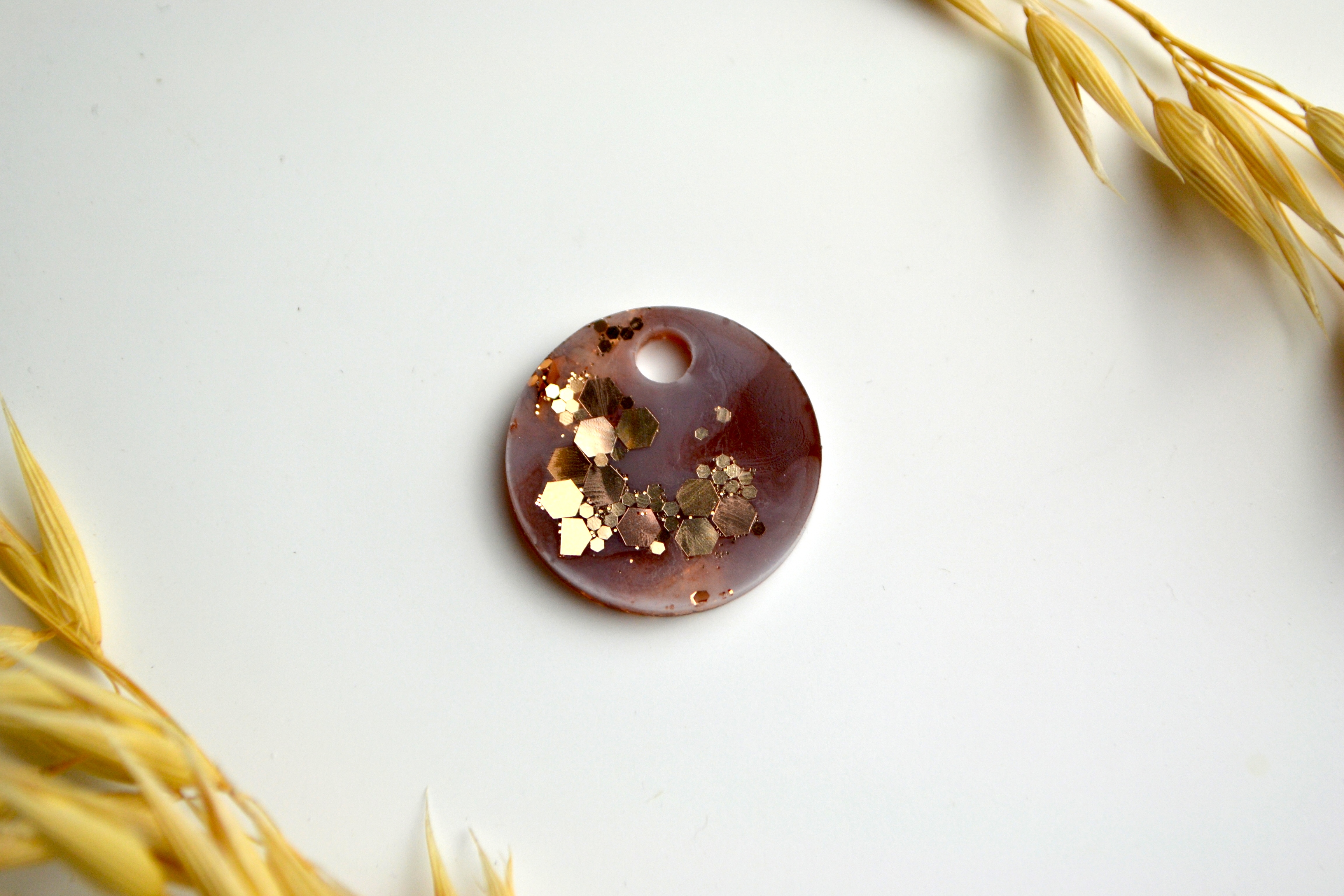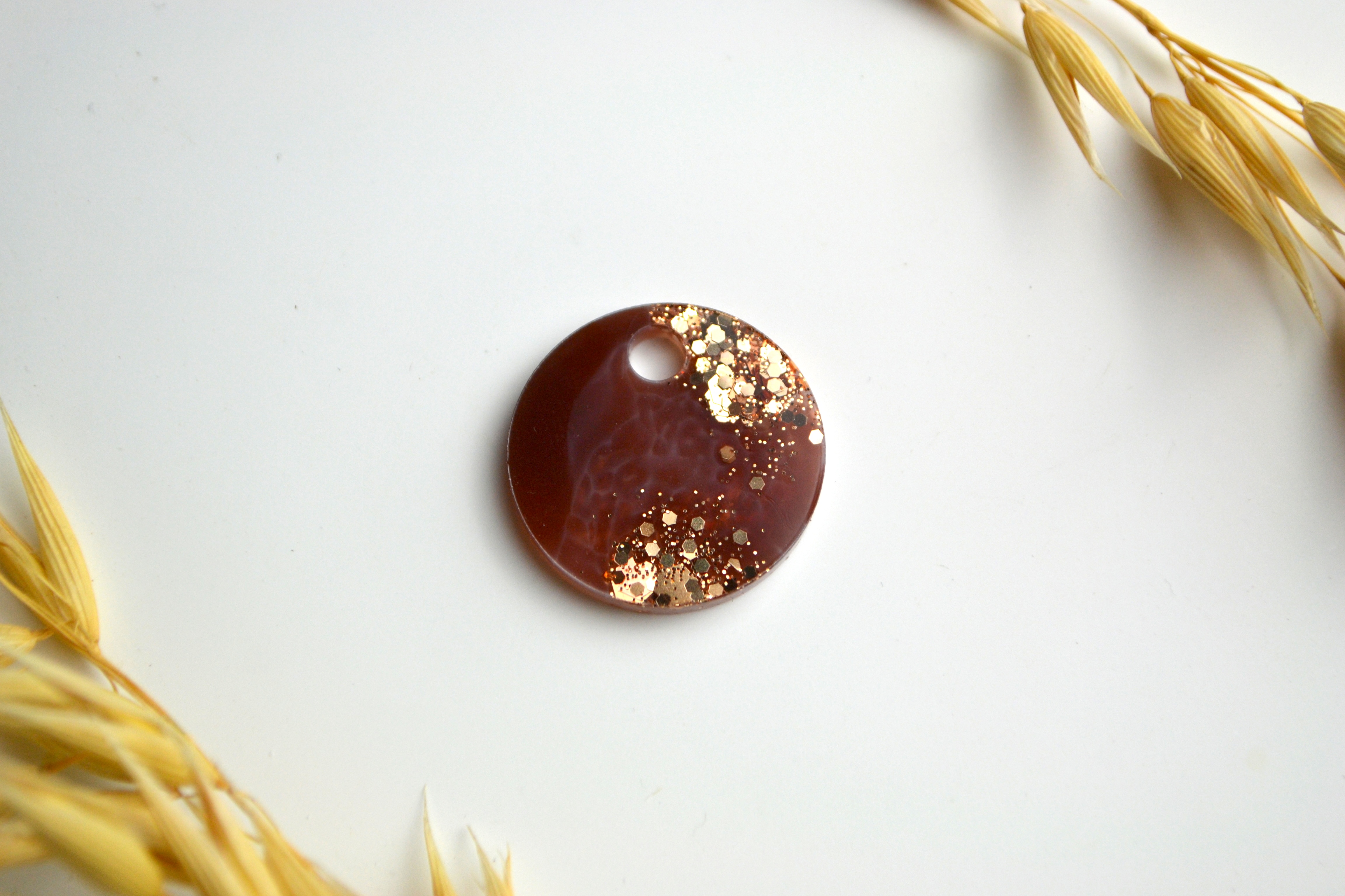 Hundetegn, lille rund, caramel, hvid, guld glimmer