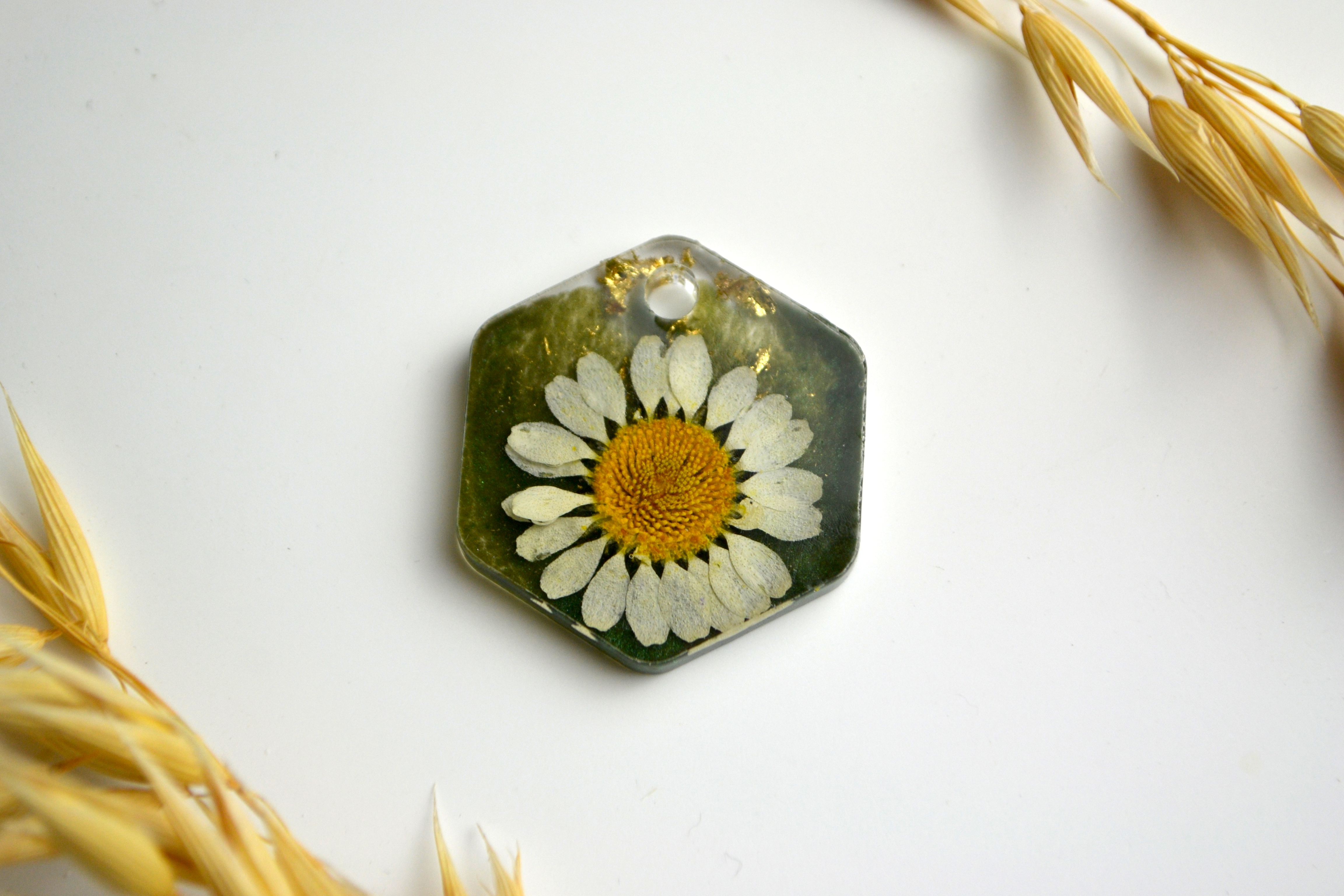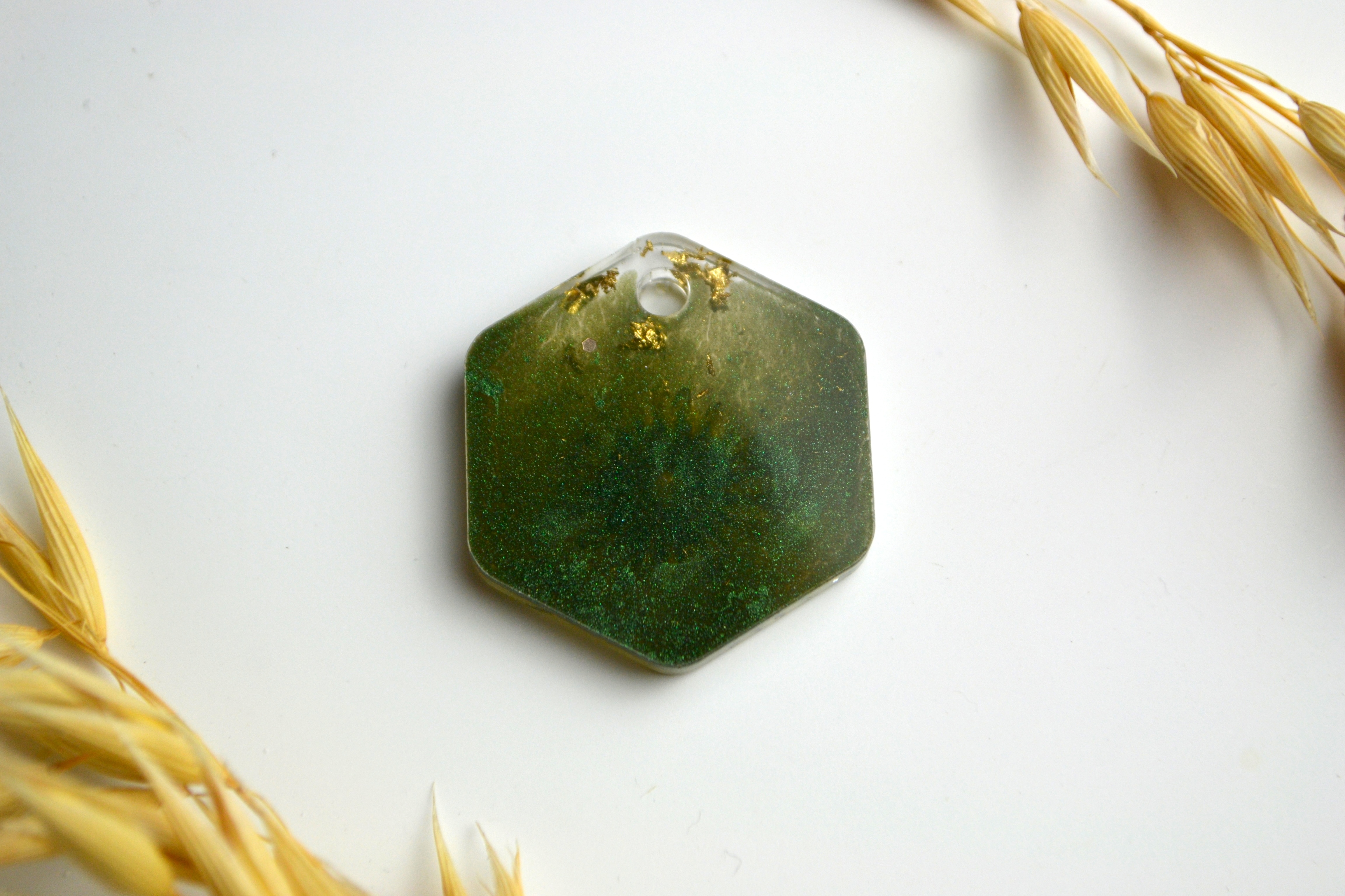 Hundetegn, mellem hexagon, grøn shimmer med bladguld og en tørret margorit