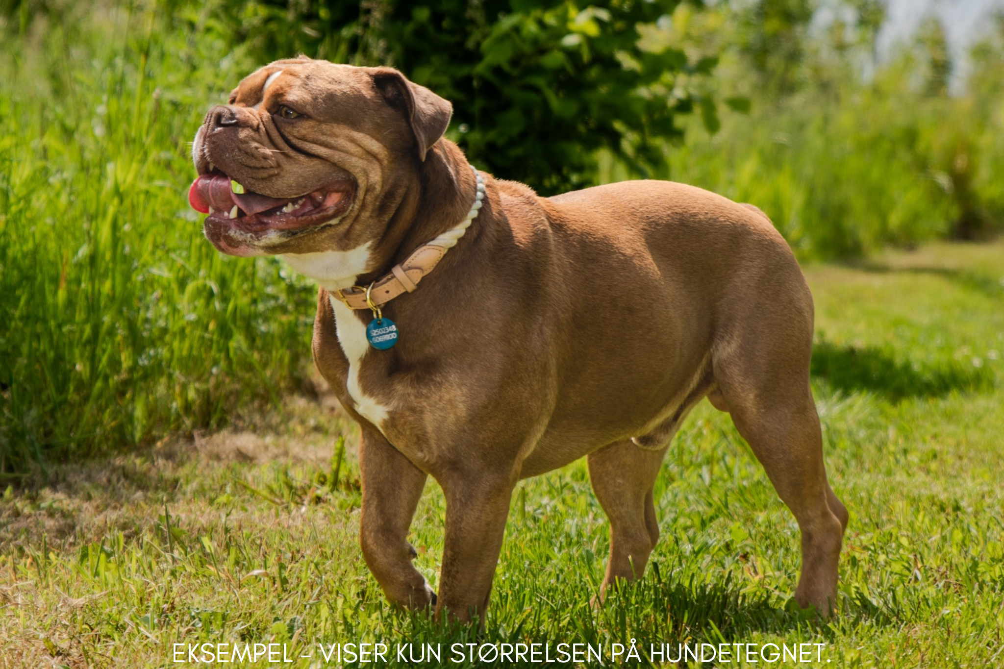 🔹 De fleste vælger at få hundens navn på forsiden – og ejers navn, adresse og telefonnummer på bagsiden.