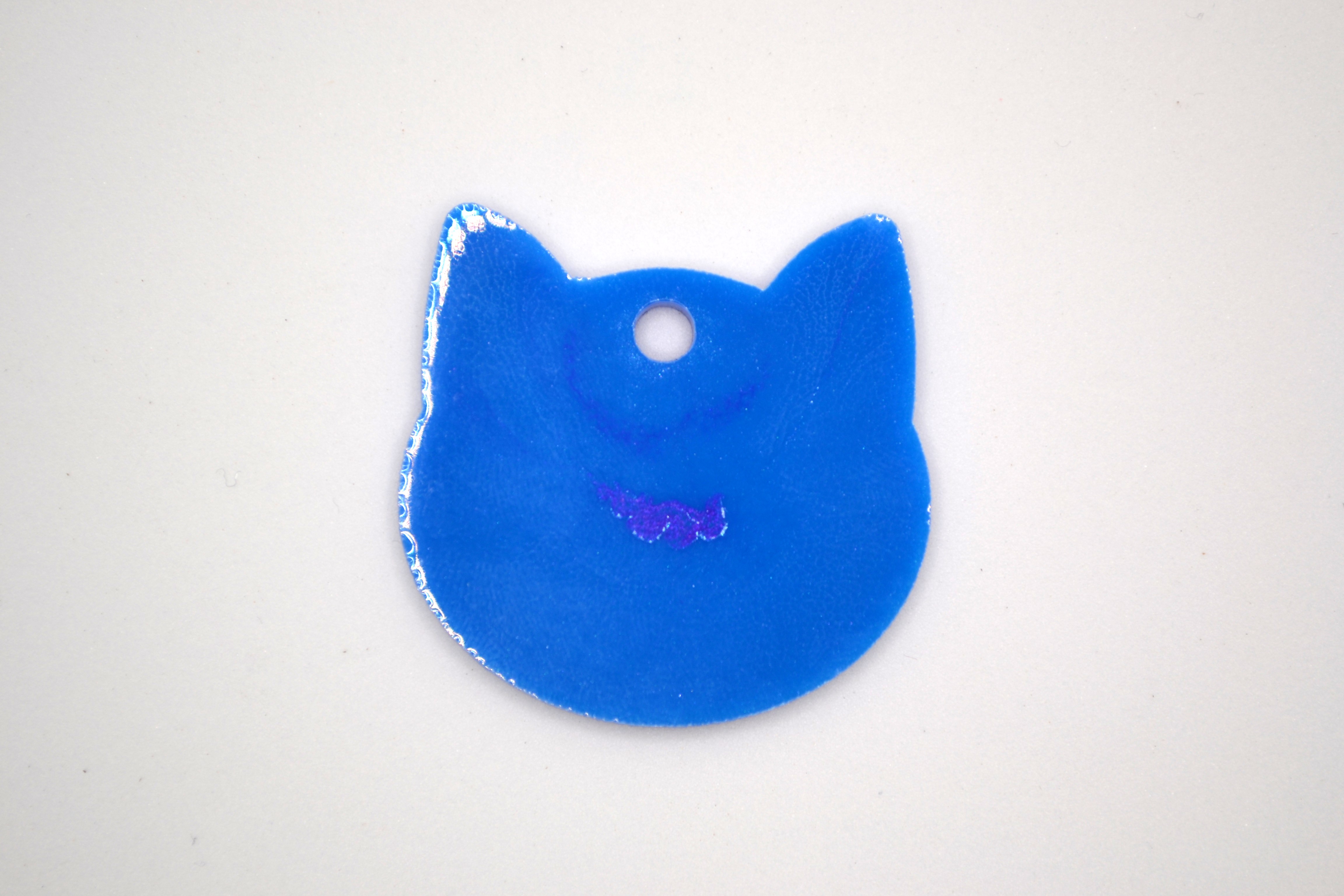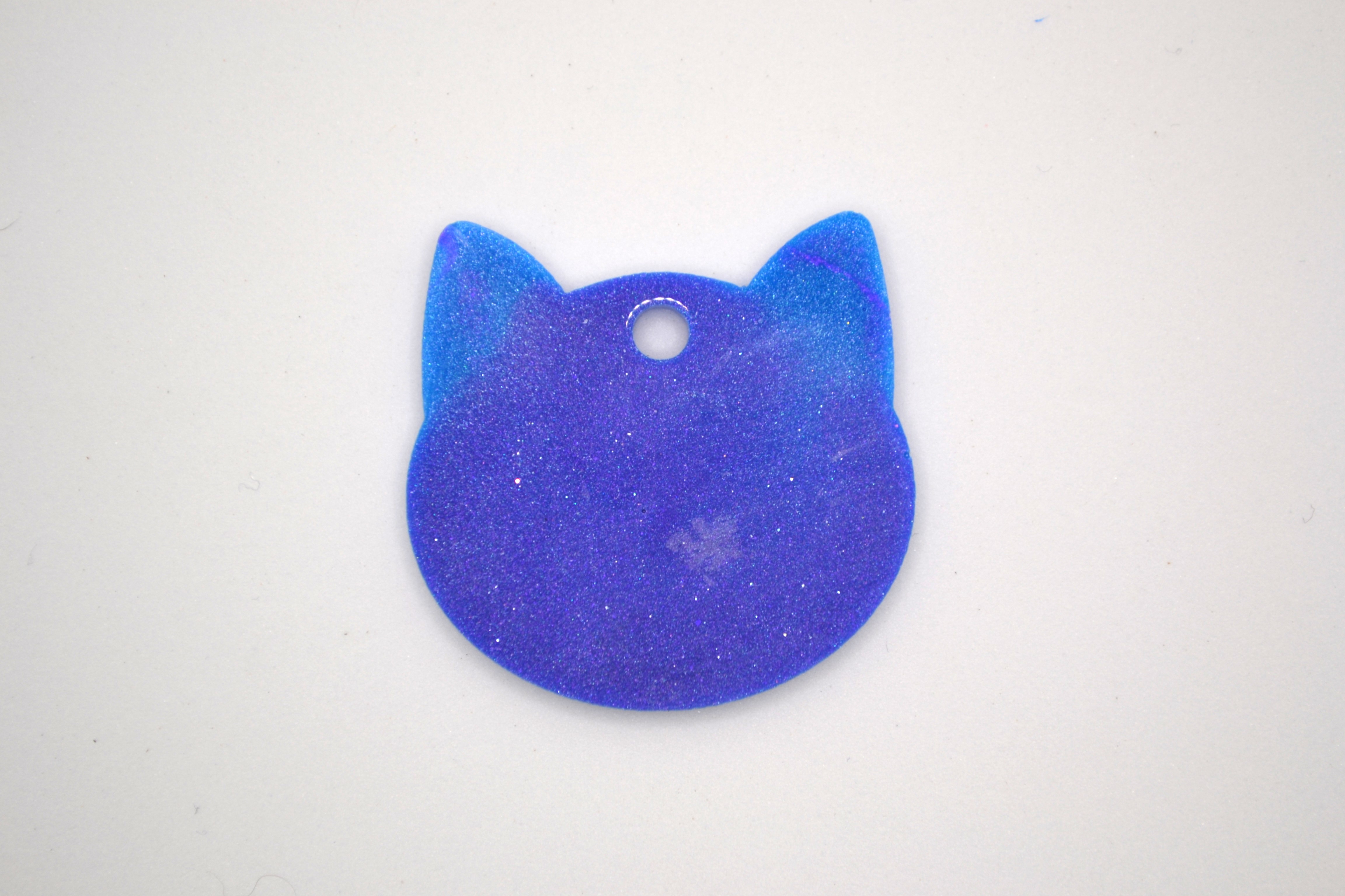 Hundetegn, stort kattehoved, blå med lilla glitter